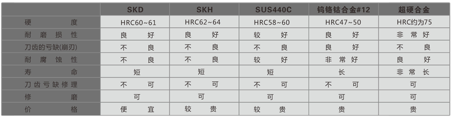 ● 合金的种类 在JIS (日本工业规格)中一般情况下使用K20 , K30 ,最近由于用户对耐腐蚀合金的需要加大,本公司将使用此类新开发的耐腐蚀超硬合金来满足客户的需求。